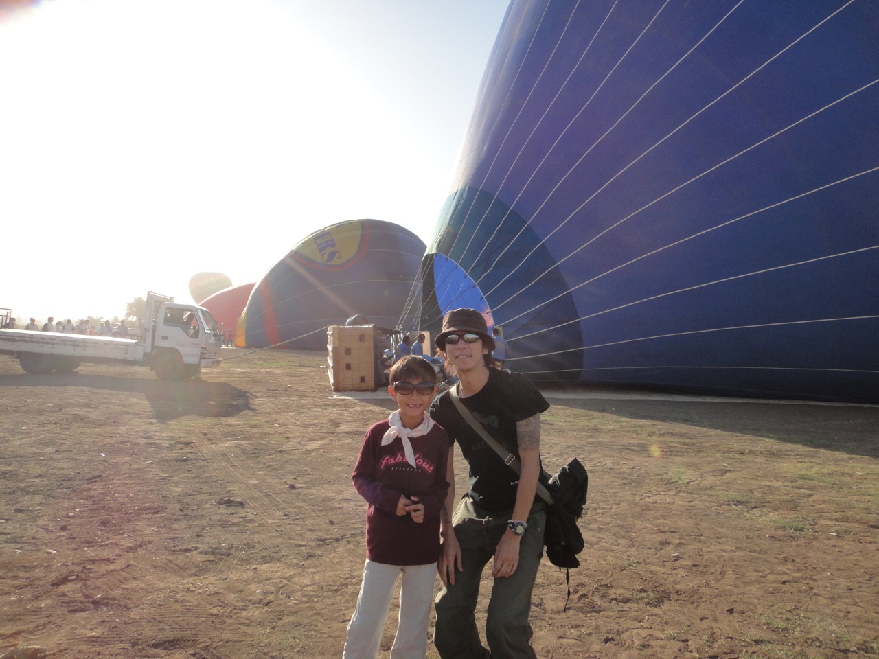 対岸で待機していた別の白いバンに乗り込み、ナイル西岸 – ウェストバンク – に点在する遺跡群を横目に走ること10分ほどで、野球場が2つは優に入りそうな、巨大な気球乗り場に到着した。気球ツアー会社は複数あるようで、自分たちの乗る気球が膨らむまでの間、初めて間近で見る気球を見上げては、その大きさと穏やかさにひととき安心する。早朝のフィールドに響くのはバーナーを景気よく吹かす音だけ。韓国から来た子供と何気ないコミュニケーションをとるうちに、なんでこの子たちは世界共通で美しいのに、と思った。