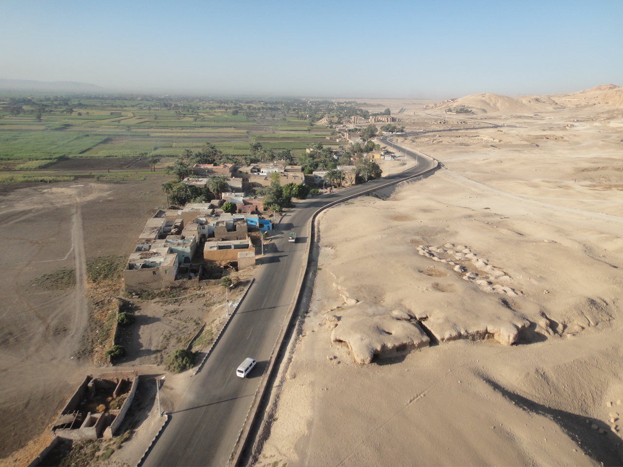 10分と待つ事なく我々の気球の準備が整い、階段状のステップからバスケットに乗り込む。こんな籐細工で大丈夫なのか??なんて思うのも束の間、パイロットが気前良くバーナーを吹かすと、気球はふわりと宙に浮き、どんどんとその高度を上げていった(注:籐細工は耐久性も強度も、ランディングの衝撃を和らげるのにも最適な素材だそうです)。気球の乗り心地はなんとも不思議。方向舵はないため、パイロットは行きたい方向に風が吹いている高度を見つけて、気球をルートに乗せるのだ。ナイルから西に少し飛ぶと、いよいよハトシェプスト葬祭殿や王家の谷が座す、エル=クルーン山を含むネクロポリスが見えてくる。なんだよ、すげえじゃねえかこれ。ナイルの両岸に沿って広がる穀倉地と、その周りに広がる対照的な岩と砂だけの山々。朝もやに照りつける太陽。もやの向こうに微かに見える稜線は、昔から自分の好きなものトップ10に入っている。地面に落ちる気球達の影を目で追うかたわら、眼下に広がる家々の中には、きっと今まさに二度寝を楽しむ人や、朝食の用意をする母親や、走り回る子供達がいる。幸あれ!